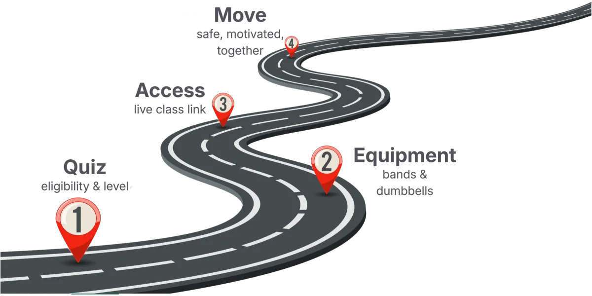 Guided online classes following the MOVE 2 IMPROVE method, combining a short physiotherapy-based warm-up with Pilates and strength training using free weights. Train live from home with structure, motivation, and community. Camera on is optional for real-time cues and encouragement. Not personalized — ideal if you enjoy group energy, accountability, and feeling supported.